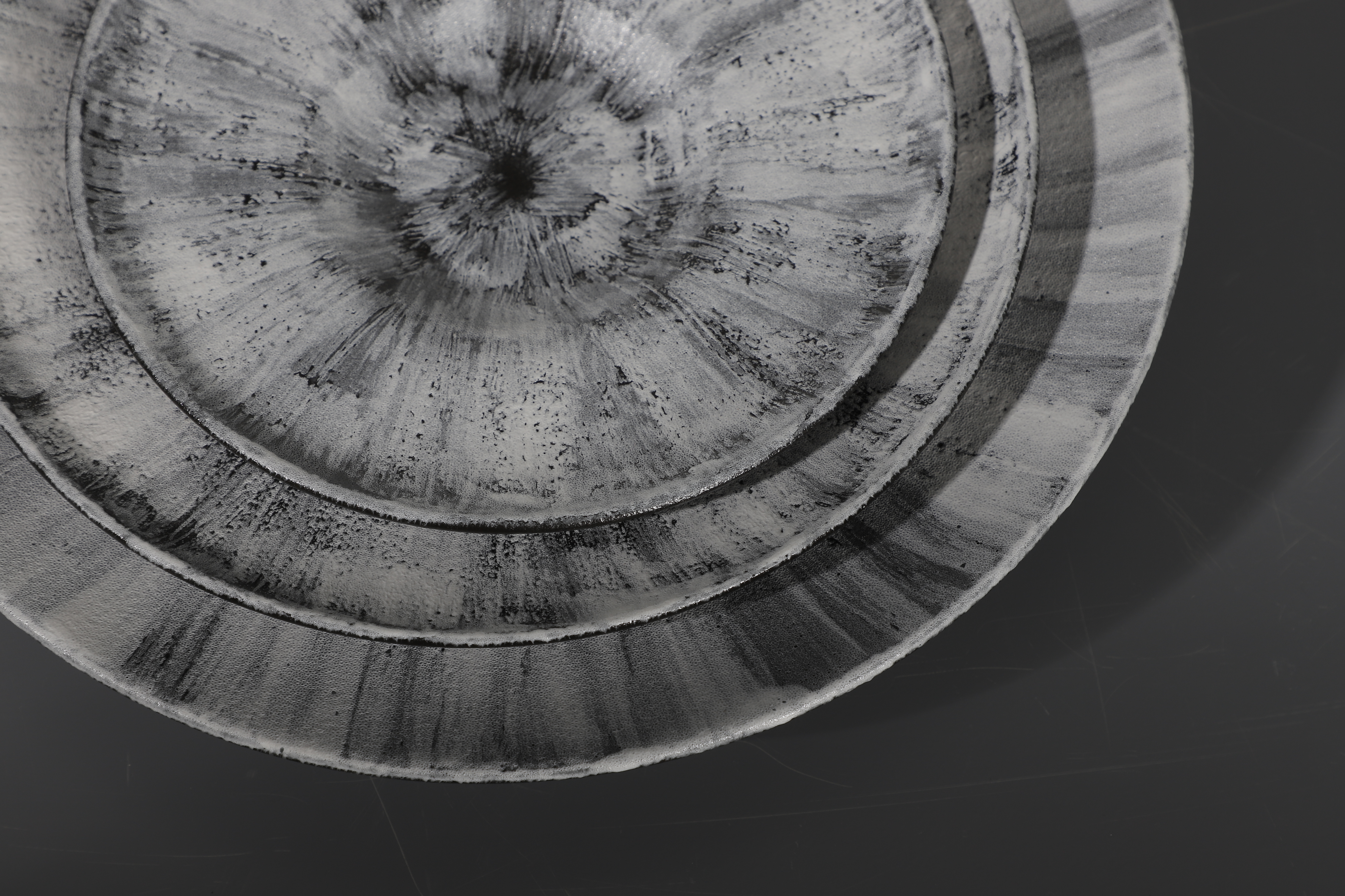The glaze application mimics hand-brushed strokes, with dense dark centers fading to soft edges, forming a natural radial flow. Subtle texture variations add tactile depth, while the consistent grayscale palette lends versatility to diverse table settings.