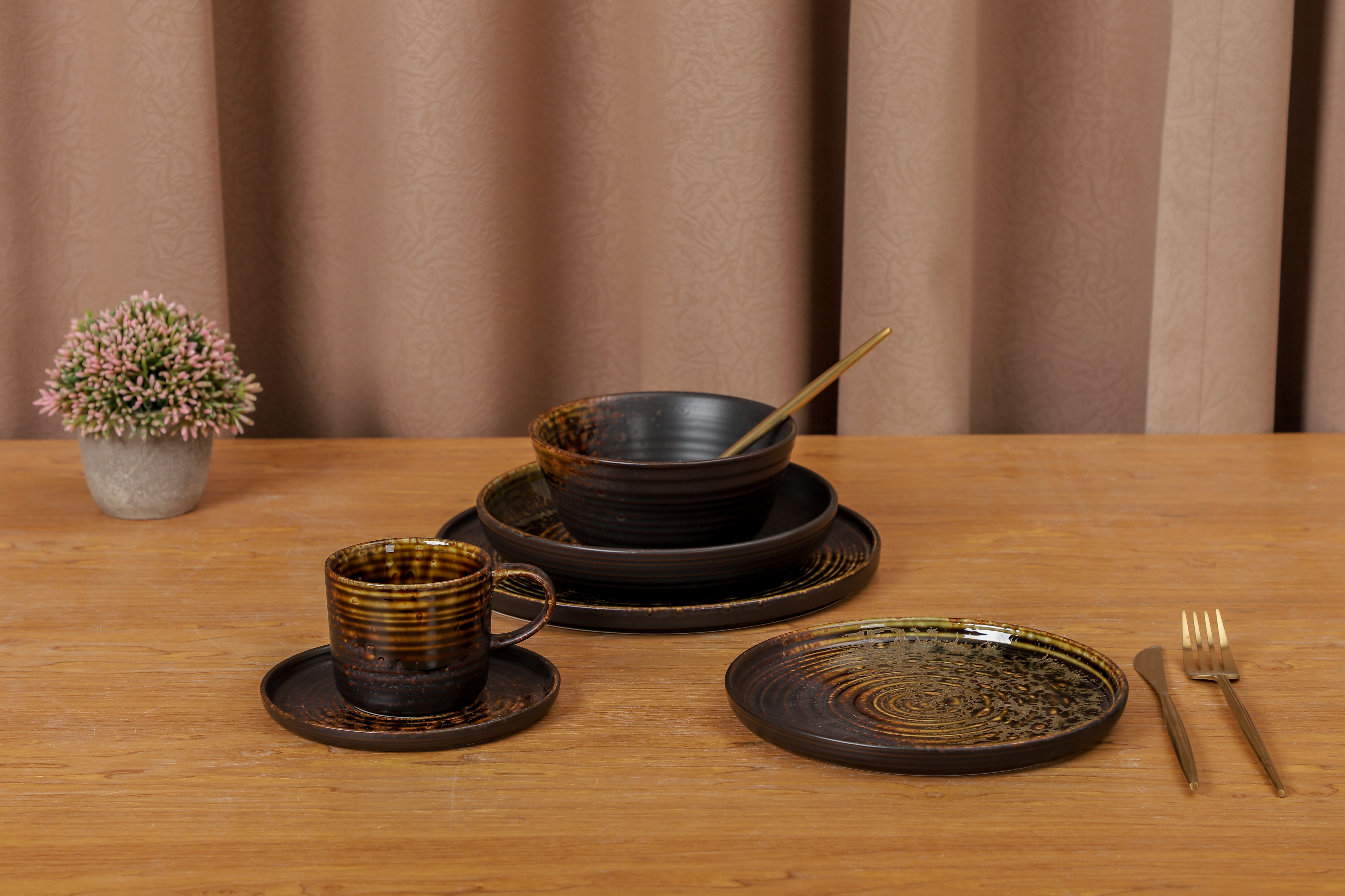 This collection embodies wabi-sabi aesthetics, celebrating unique reactive glaze and natural beauty. The versatile design language spans paltes, bowls, wine pot, and tea sets. It embodies understated sophistication, seamlessly complementing contemporary, industrial, and rustic interior aesthetics with its timeless, nature-inspired appeal.
