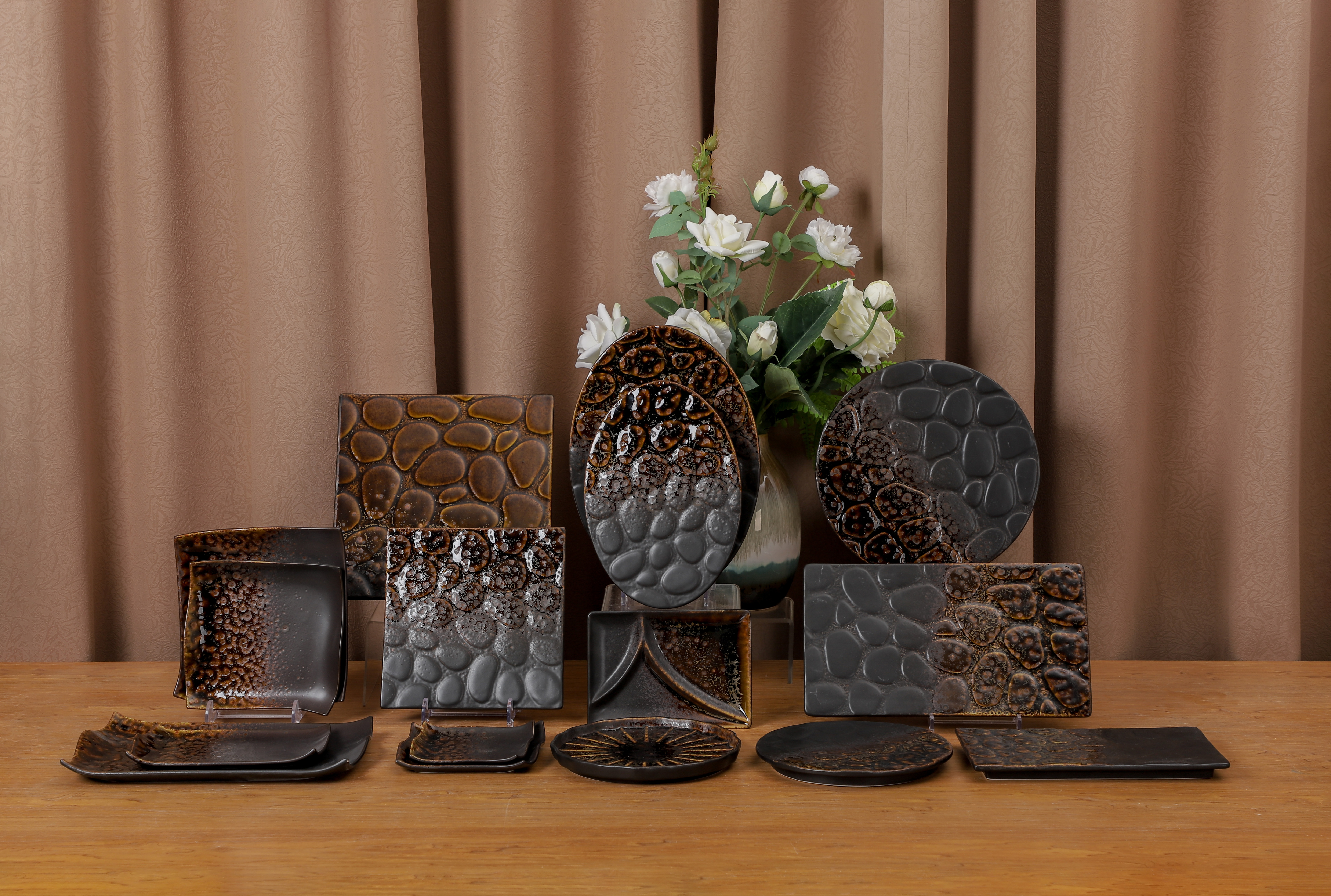 The collection features two signature textures: pebble-like relief and concentric ripple carvings. The glossy amber glaze pools at edges, contrasting with matte charcoal, enhancing depth and visual drama. The unrepeatable patterns highlights each piece’s handcrafted artistry and dimensional depth.